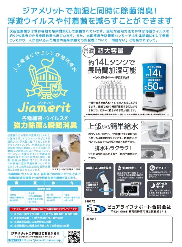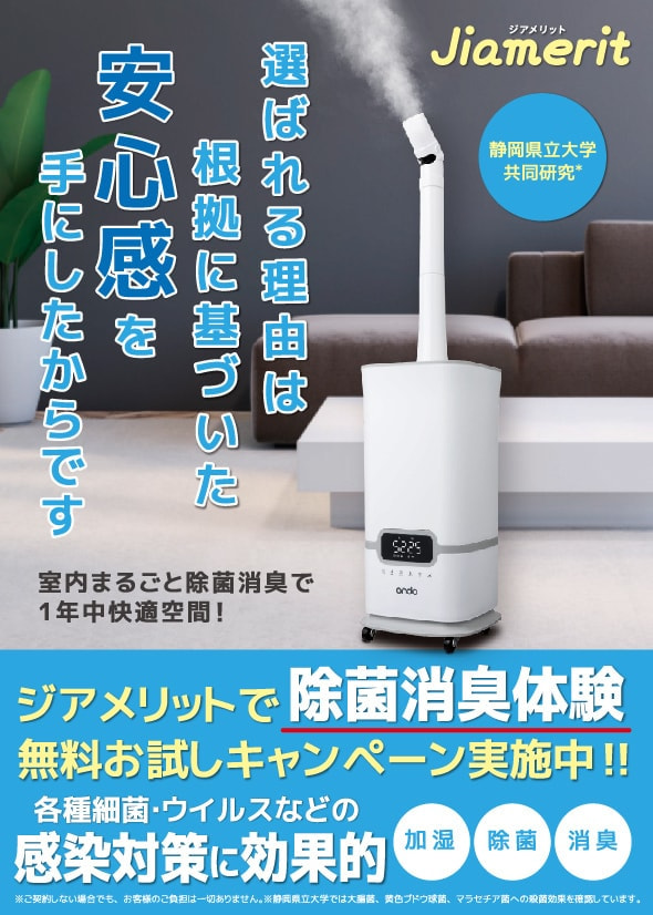 た、超音波加湿器などを利用して「ジアメリット」を空間に噴霧することで誰でも簡単に室内の除菌・消臭を行うことができます。